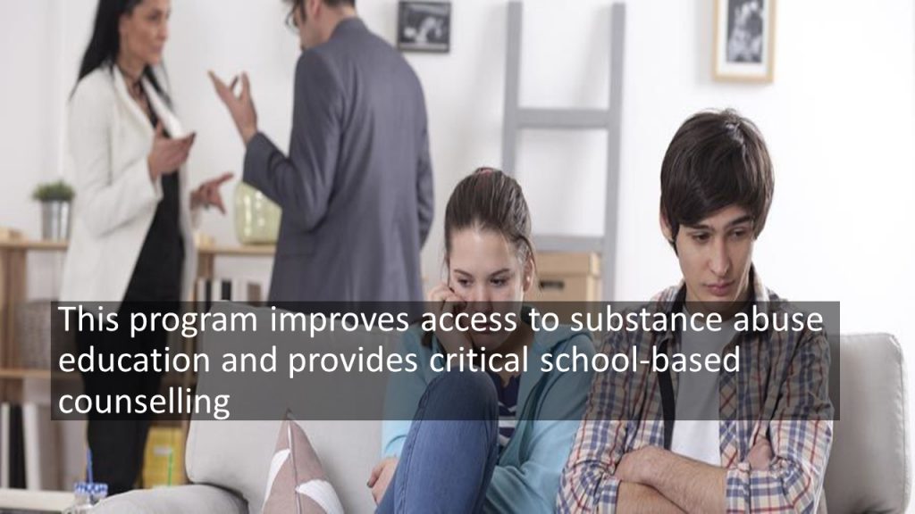 Substance abuse is a serious problem in the grade 7 to 12 population. This program improves access to substance abuse education and provides critical school-based counselling to students and parents affected by drug or alcohol addiction.