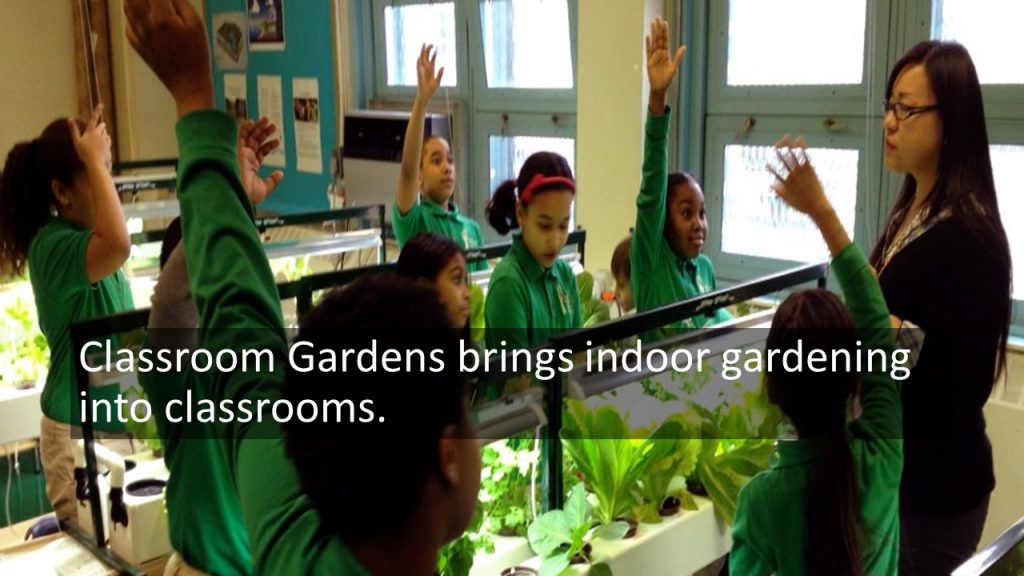 Classroom Gardens brings indoor gardening into classrooms. Throughout the school year, and even through the winter months, young students grow vegetables from seed and learn in a hands-on way about plants, nutrition, healthy eating, and entrepreneurship. Students have the opportunity to eat the food they grow, and share it with their friends, family, and the broader community.